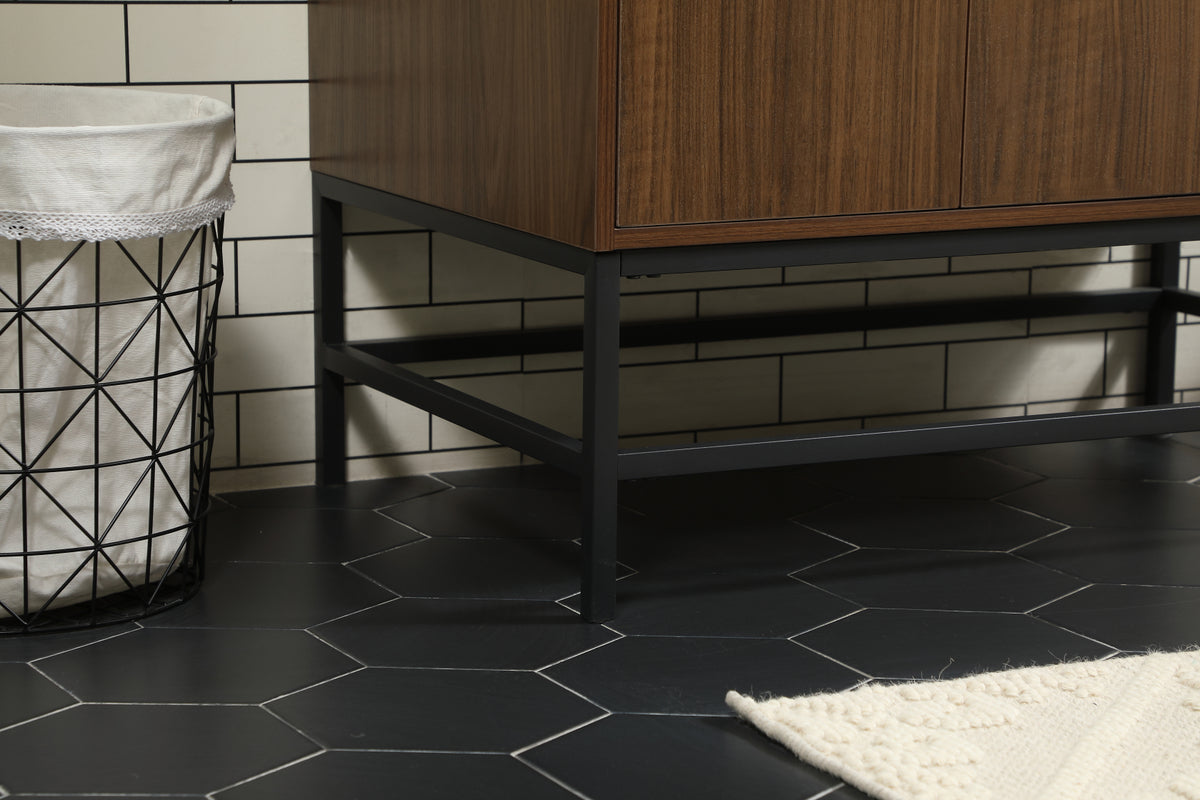 This vanity is a sleek-looking piece of bathroom furniture that is easy to incorporate into your design scheme. The cabinet features a smooth door panel with an oversized steel handle and soft close hinges provide ample room for accessories. Constructed of engineered wood, the powder-coated metal rod legs are an urban industrial look that we love. Minor assembly of the metal legs needed to get this vanity up and running. Comes with a matching backsplash to complete the look and protects your wall.