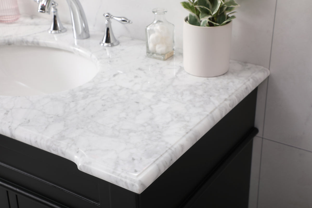 The Wesley Collection vanity cabinet will bring a settle pop of color into your bathroom. The flattering finish is a sophisticated color which creates a calming atmosphere in the room. The brushed nickel knobs bring a vibrant touch to balance the vanity. With the detailed engravings, the cabinet catches eyes with its beautiful lining work. Open the cabinet doors to store what you desire and make use of the spacious area. To top it off, the Carrara white marble adds a luxury and modern finish to the countertop.