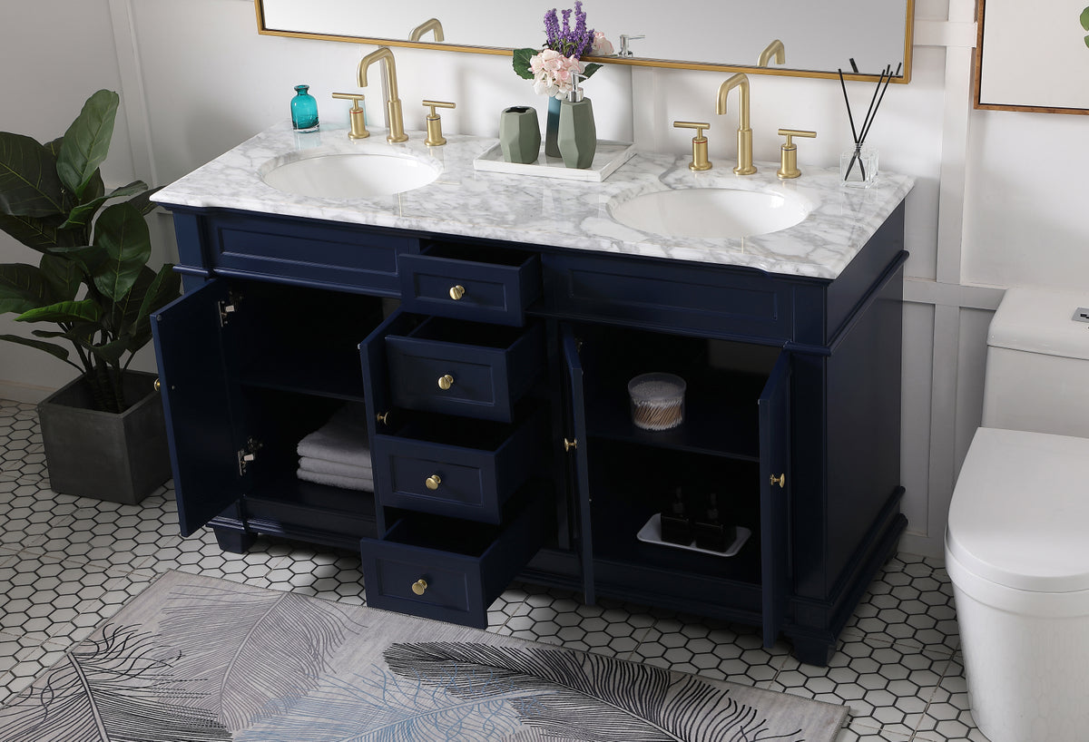 The Wesley Collection vanity cabinet will bring a settle pop of color into your bathroom. The navy blue is a cool color which creates a calming atmosphere in the room. The gold knobs bring a vibrant touch to balance the vanity. With the detailed engravings, the cabinet catches eyes with its beautiful lining work. Open the cabinet doors to store what you desire and make use of the spacious area. To top it off, the Carrara white marble adds a luxury and modern finish to the countertop.