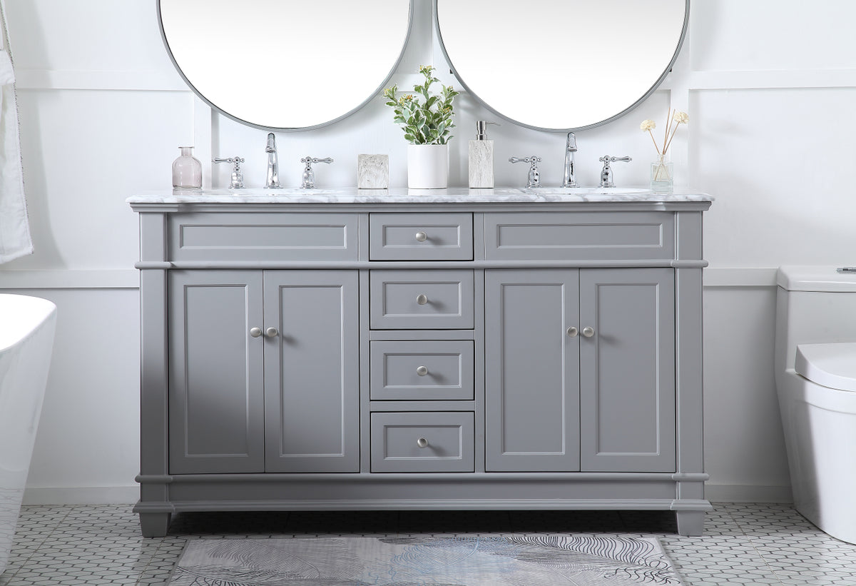 The Wesley Collection vanity cabinet will bring a settle pop of color into your bathroom. The gray finish is a sophisticated color which creates a calming atmosphere in the room. The brushed nickel knobs bring a vibrant touch to balance the vanity. With the detailed engravings, the cabinet catches eyes with its beautiful lining work. Open the cabinet doors to store what you desire and make use of the spacious area. To top it off, the Carrara white marble adds a luxury and modern finish to the countertop.