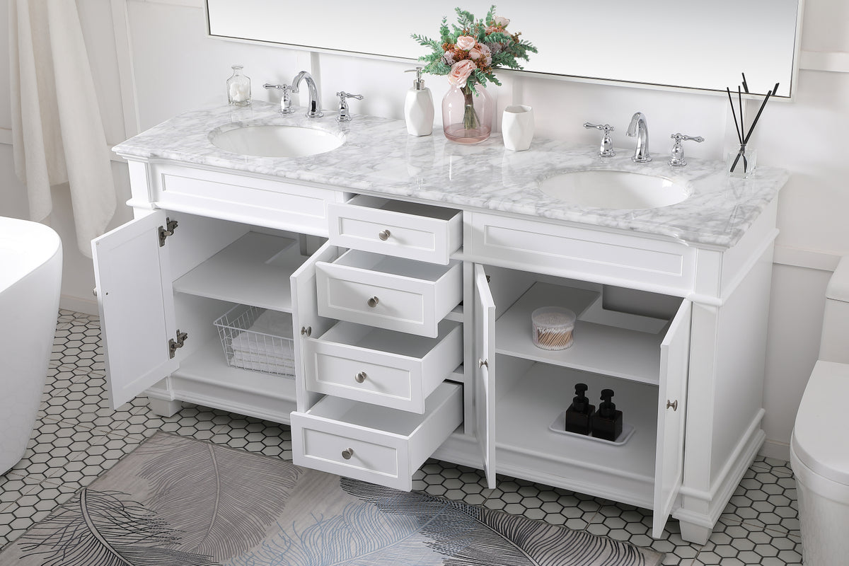 The Wesley Collection vanity cabinet will bring a settle pop of color into your bathroom. The white finish is a sophisticated color which creates a calming atmosphere in the room. The brushed nickel knobs bring a vibrant touch to balance the vanity. With the detailed engravings, the cabinet catches eyes with its beautiful lining work. Open the cabinet doors to store what you desire and make use of the spacious area. To top it off, the Carrara white marble adds a luxury and modern finish to the countertop.