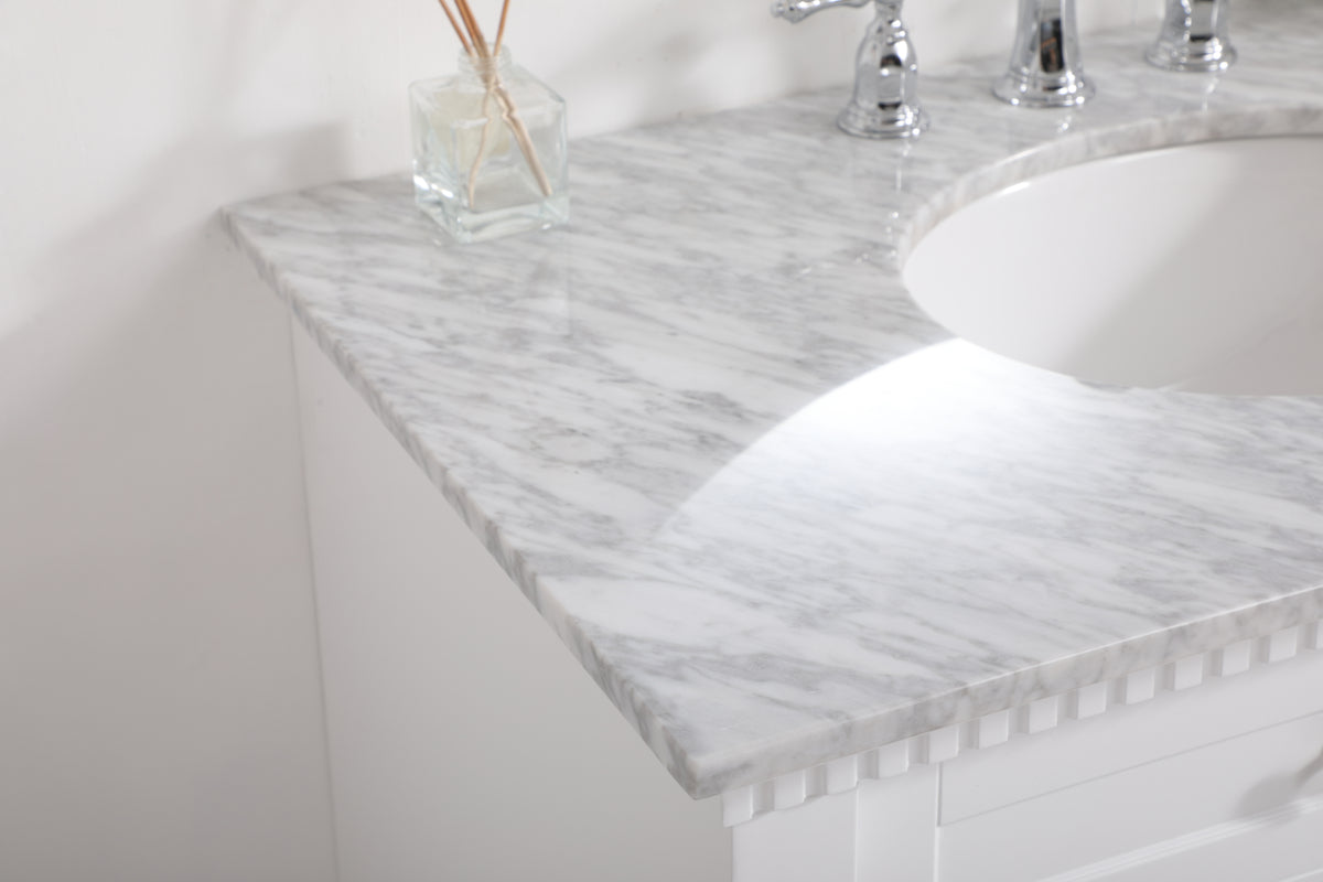 Make the most of your space with this traditional style bathroom vanity. Its traditional style is able to complement many aesthetics, natural marble countertop, and the round brushed nickel knobs that sits above the soft closing doors, allowing you to store an assortment of bathroom essentials. The lower shelf makes it the perfect space to hold new towels for your guests. This compact vanity ensures both form and function in your bathroom or powder room for you and your guests.