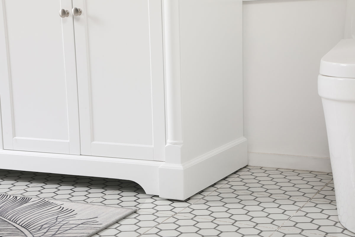 Make the most of your space with this traditional style bathroom vanity. Its traditional style is able to complement many aesthetics, natural marble countertop, and the round brushed nickel knobs that sits above the soft closing doors, allowing you to store an assortment of bathroom essentials. The lower shelf makes it the perfect space to hold new towels for your guests. This compact vanity ensures both form and function in your bathroom or powder room for you and your guests.