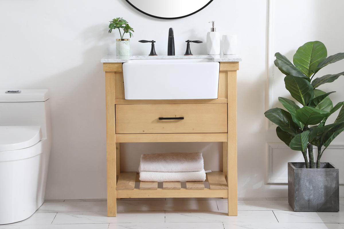 Make the most of your space with this farmhouse style bathroom vanity. Complements well with its beautiful finish, carrara white marble countertop, and the contemporary slender handle bar that sits on the functional drawers with soft closing mechanism, allowing you to store an assortment of bathroom essentials. The lower shelf makes it the perfect space to hold new towels for your guests. This stylish vanity ensures both form and function in your bathroom for you and your guests.