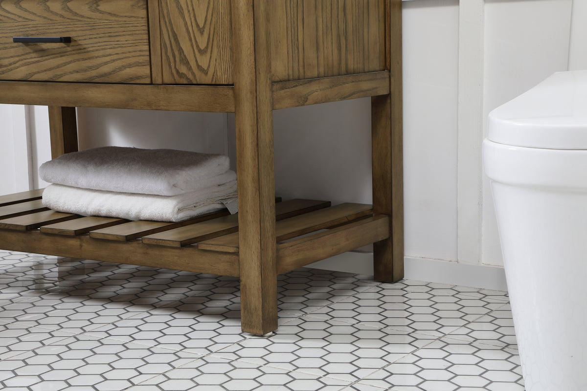 Make the most of your space with this farmhouse style bathroom vanity. Complements well with its beautiful finish, carrara white marble countertop, and the contemporary slender handle bar that sits on the functional drawers with soft closing mechanism, allowing you to store an assortment of bathroom essentials. The lower shelf makes it the perfect space to hold new towels for your guests. This stylish vanity ensures both form and function in your bathroom for you and your guests.