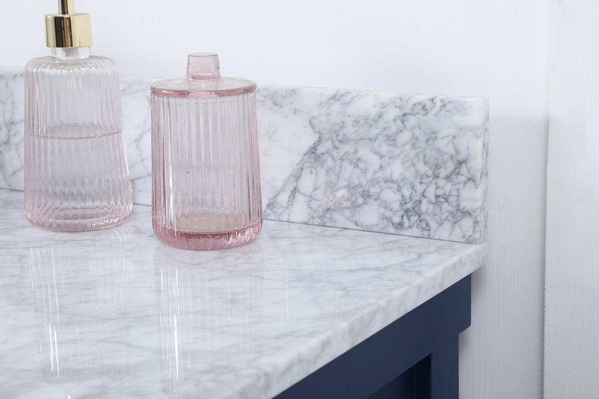 Make the most of your space with this farmhouse style bathroom vanity. Complements well with its beautiful finish, carrara white marble countertop, and the contemporary slender handle bar that sits on the functional drawers with soft closing mechanism, allowing you to store an assortment of bathroom essentials. The lower shelf makes it the perfect space to hold new towels for your guests. This stylish vanity ensures both form and function in your bathroom for you and your guests. Comes with a matching backsplash to complete the look and protects your wall.