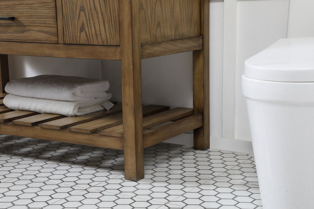 Make the most of your space with this farmhouse style bathroom vanity. Complements well with its beautiful finish, carrara white marble countertop, and the contemporary slender handle bar that sits on the functional drawers with soft closing mechanism, allowing you to store an assortment of bathroom essentials. The lower shelf makes it the perfect space to hold new towels for your guests. This stylish vanity ensures both form and function in your bathroom for you and your guests.