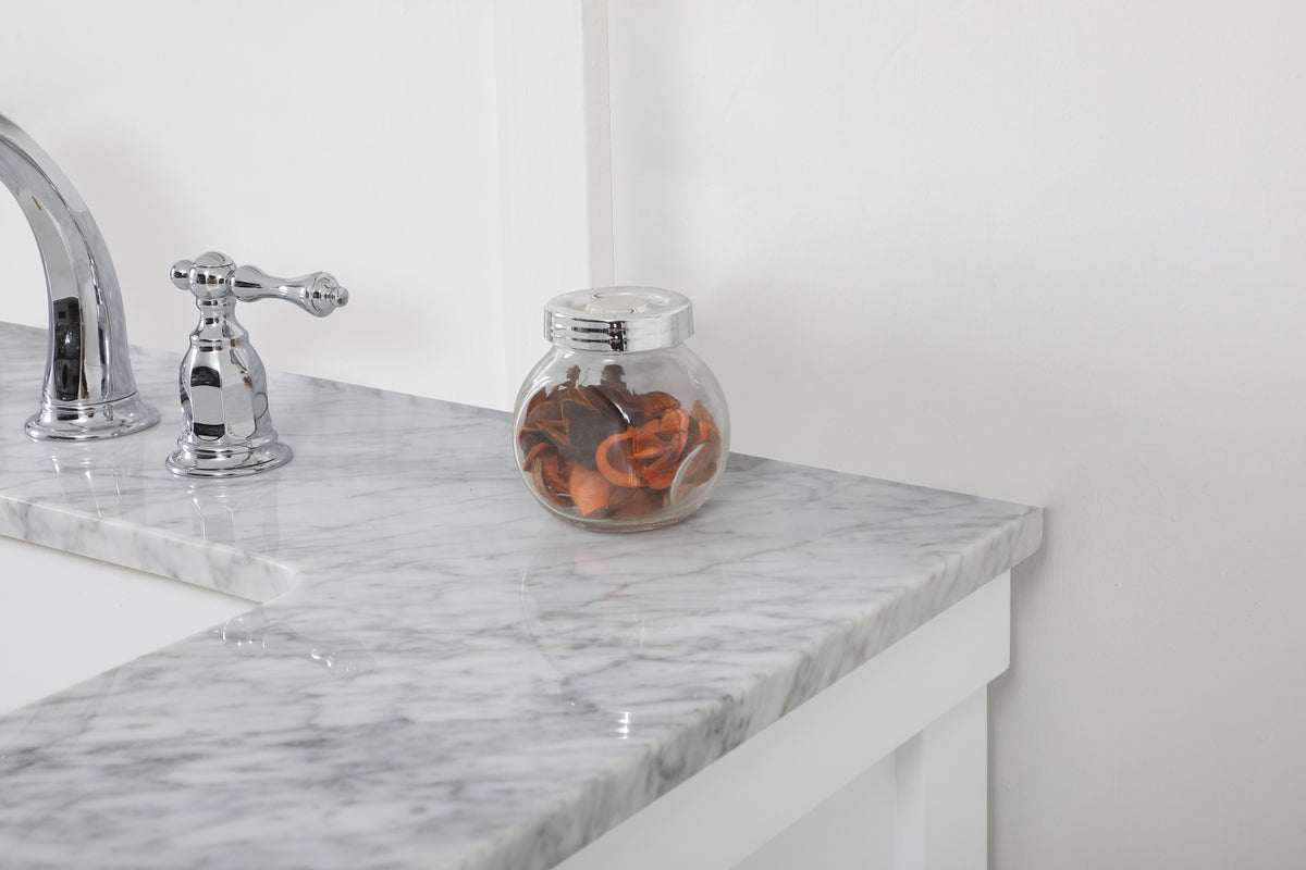 Make the most of your space with this farmhouse style bathroom vanity. Complements well with its beautiful finish, carrara white marble countertop, and the contemporary slender handle bar that sits on the functional drawers with soft closing mechanism, allowing you to store an assortment of bathroom essentials. The lower shelf makes it the perfect space to hold new towels for your guests. This stylish vanity ensures both form and function in your bathroom for you and your guests.