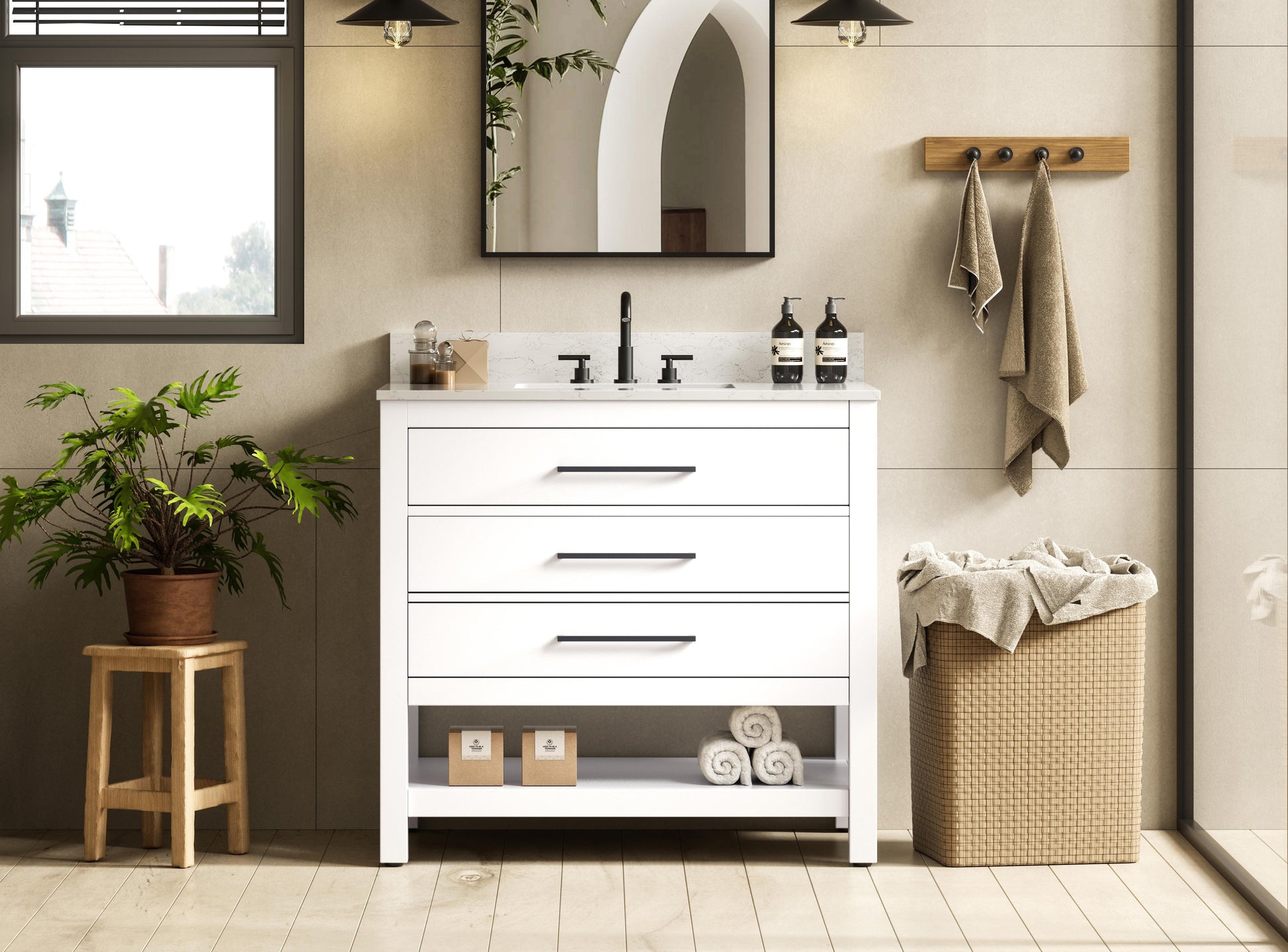 Elevate your bathroom design with this versatile and beautifully crafted bathroom vanity cabinet. The engineered marble top features striking veining, adding a luxurious focal point to your space. Built from premium solid wood and MDF, it ensures long-lasting durability and strength. The porcelain sink, complete with a concealed overflow, offers a seamless and refined finish. Available in four stunning finishes—Chestnut Brown, Honey Brown, Mocha Brown, and White—this vanity suits any interior style. Designed with convenience in mind, it features soft-closing drawers with modern handles and a tip-out drawer for easy access to small essentials, keeping your space tidy. The bottom deep drawer mimics the appearance of two separate drawers, providing ample storage for larger items, while the open shelf at the base offers additional storage space for towels or decor. Fully assembled for your convenience, it includes foot levelers for stability on any surface. For a complete look, pair it with a matching backsplash. UPC certified for quality assurance, this vanity is the perfect combination of functionality, style, and ease of use.
