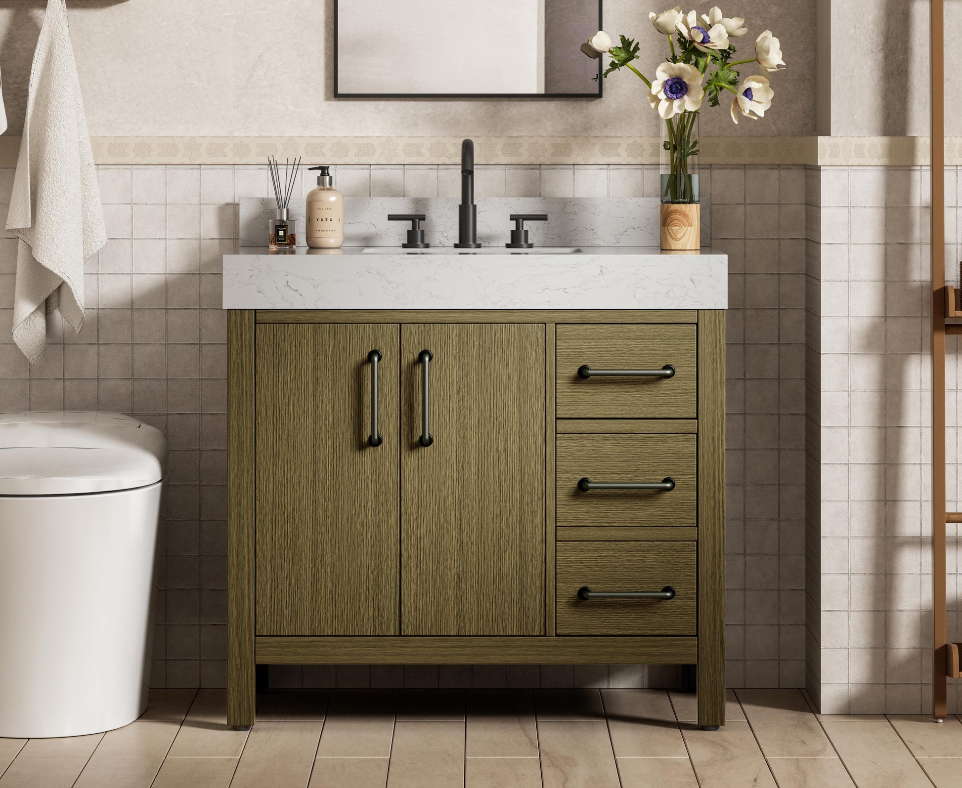 This bathroom vanity embodies a clean, minimalist design, perfectly suited for modern and transitional spaces. Its straight, sleek lines and flat-paneled doors create a refined yet approachable look. The warm, honey-toned finish highlights the subtle wood grain, adding visual interest while maintaining a sense of balance and simplicity. The vanity features a functional layout, with two cabinet doors on one side and three stacked drawers on the other, creating a balanced and organized look. Matte black hardware, including slim and cylindrical pulls, contrasts elegantly against the warm wood, reinforcing its contemporary vibe while providing subtle visual interest. The thick engineered marble countertop in crisp white adds a sharp contrast to the warm base, creating a visually dynamic combination that is both functional and stylish. This vanity is perfect for those seeking a design that combines modern simplicity with a touch of bold refinement. This vanity is delivered fully assembled and equipped with foot levelers for effortless installation and stability. Combining practicality and bold design, this vanity is UPC certified and ready to transform your bathroom space. The matching backsplash seamlessly integrates with the countertop, offering a cohesive design that protects walls from splashes while maintaining a unified look.