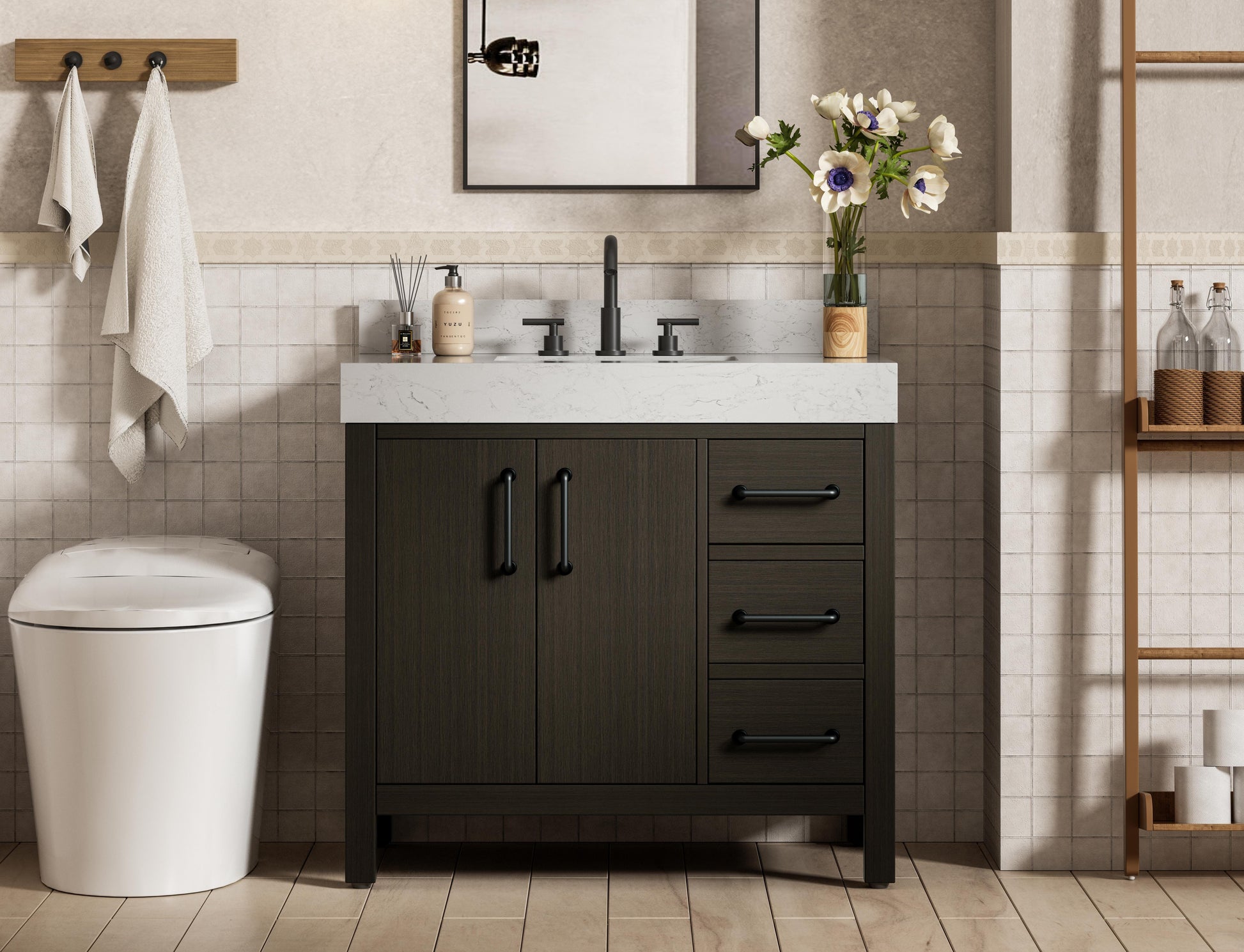 This bathroom vanity embodies a sleek, modern design with a strong, minimalist appeal. The deep mocha brown finish enhances the bold and sophisticated appearance, while the flat-panel doors and drawer fronts contribute to its clean, structured aesthetic. The wood's dark tone adds depth and richness, making it a striking focal point in any bathroom setting. The vanity features a functional layout, with two cabinet doors on one side and three stacked drawers on the other, creating a balanced and organized look. Matte black hardware, including slim and cylindrical pulls, contrasts elegantly against the dark wood, reinforcing its contemporary vibe while providing subtle visual interest. The thick engineered marble countertop in crisp white adds a sharp contrast to the dark base, creating a visually dynamic combination that is both functional and stylish. This vanity is perfect for those seeking a design that combines modern simplicity with a touch of bold refinement. This vanity is delivered fully assembled and equipped with foot levelers for effortless installation and stability. Combining practicality and bold design, this vanity is UPC certified and ready to transform your bathroom space. The matching backsplash seamlessly integrates with the countertop, offering a cohesive design that protects walls from splashes while maintaining a unified look.