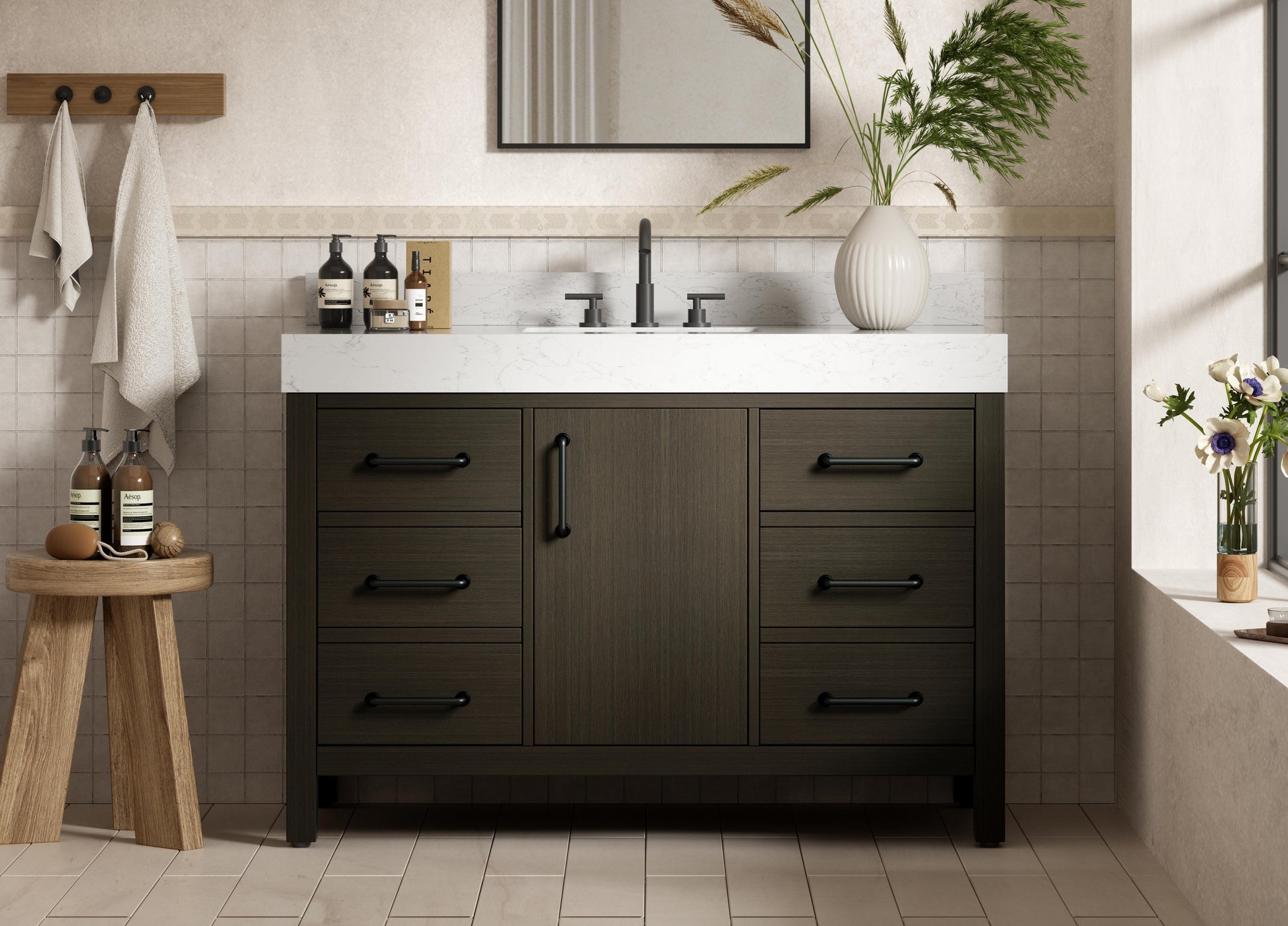 This bathroom vanity embodies a sleek, modern design with a strong, minimalist appeal. The deep mocha brown finish enhances the bold and sophisticated appearance, while the flat-panel doors and drawer fronts contribute to its clean, structured aesthetic. The wood's dark tone adds depth and richness, making it a striking focal point in any bathroom setting. Its structured design, featuring symmetrical drawers on either side and a centered door, adds balance and organization to the overall aesthetic. Matte black hardware, including slim and cylindrical pulls, contrasts elegantly against the dark wood, reinforcing its contemporary vibe while providing subtle visual interest. The thick engineered marble countertop in crisp white adds a sharp contrast to the dark base, creating a visually dynamic combination that is both functional and stylish. This vanity is perfect for those seeking a design that combines modern simplicity with a touch of bold refinement. This vanity is delivered fully assembled and equipped with foot levelers for effortless installation and stability. The matching backsplash seamlessly integrates with the countertop, offering a cohesive design that protects walls from splashes while maintaining a unified look. Combining practicality and bold design, this vanity is UPC certified and ready to transform your bathroom space.