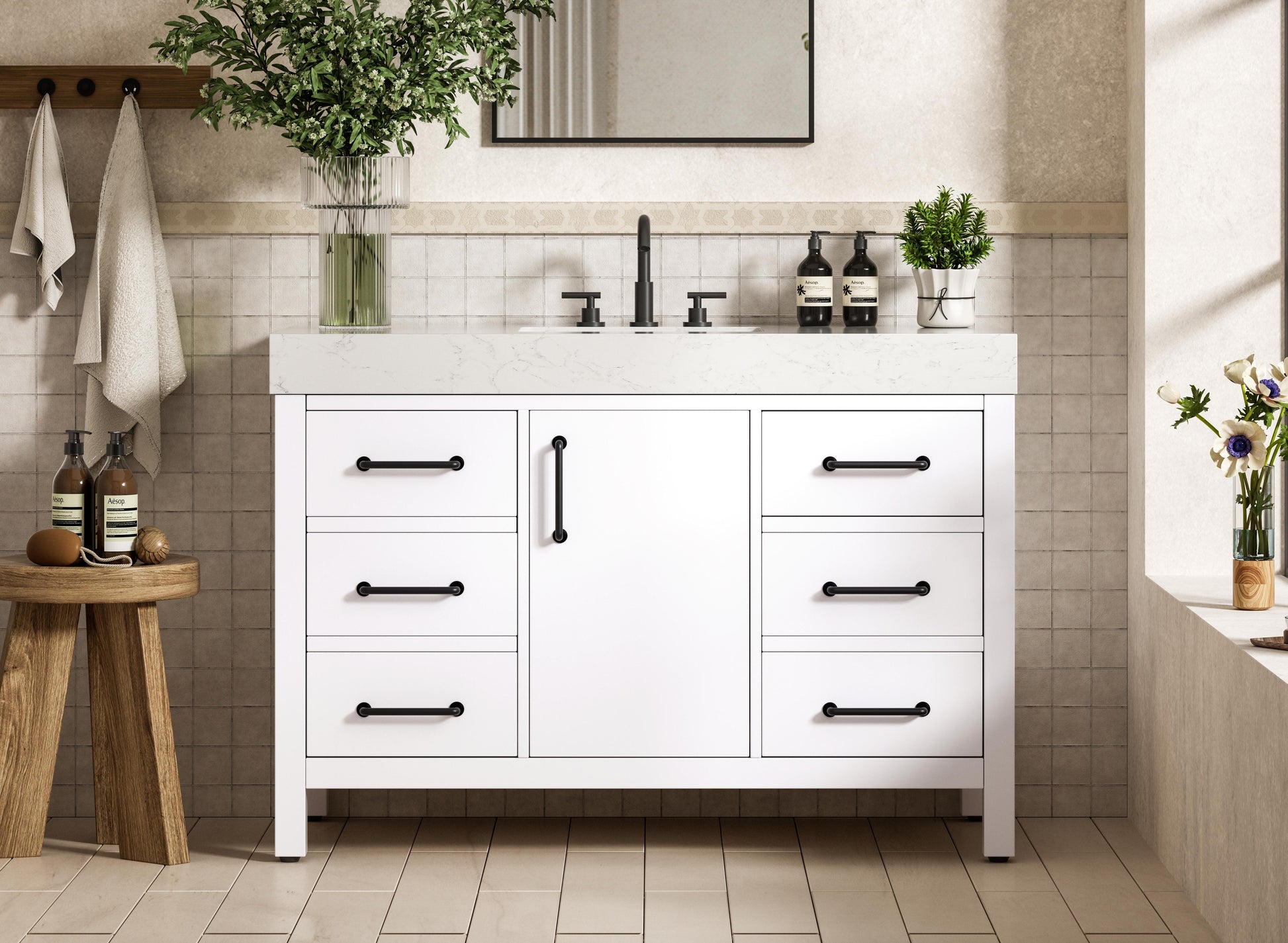 This bathroom vanity offers a clean-lined design, perfect for modern and minimalistic spaces. The bright white finish enhances the overall brightness of the room, creating a fresh and airy feel. Its structured design, featuring symmetrical drawers on either side and a centered door, adds balance and organization to the overall aesthetic. Matte black hardware, including slim and cylindrical pulls, contrasts elegantly against the white wood, reinforcing its contemporary vibe while providing subtle visual interest. The thick engineered marble countertop in crisp white adds a sharp contrast to the white base, creating a visually dynamic combination that is both functional and stylish. This vanity is perfect for those seeking a design that combines modern simplicity with a touch of bold refinement. This vanity is delivered fully assembled and equipped with foot levelers for effortless installation and stability. Complete the setup with an optional matching backsplash, sold separately. Combining practicality and bold design, this vanity is UPC certified and ready to transform your bathroom space.