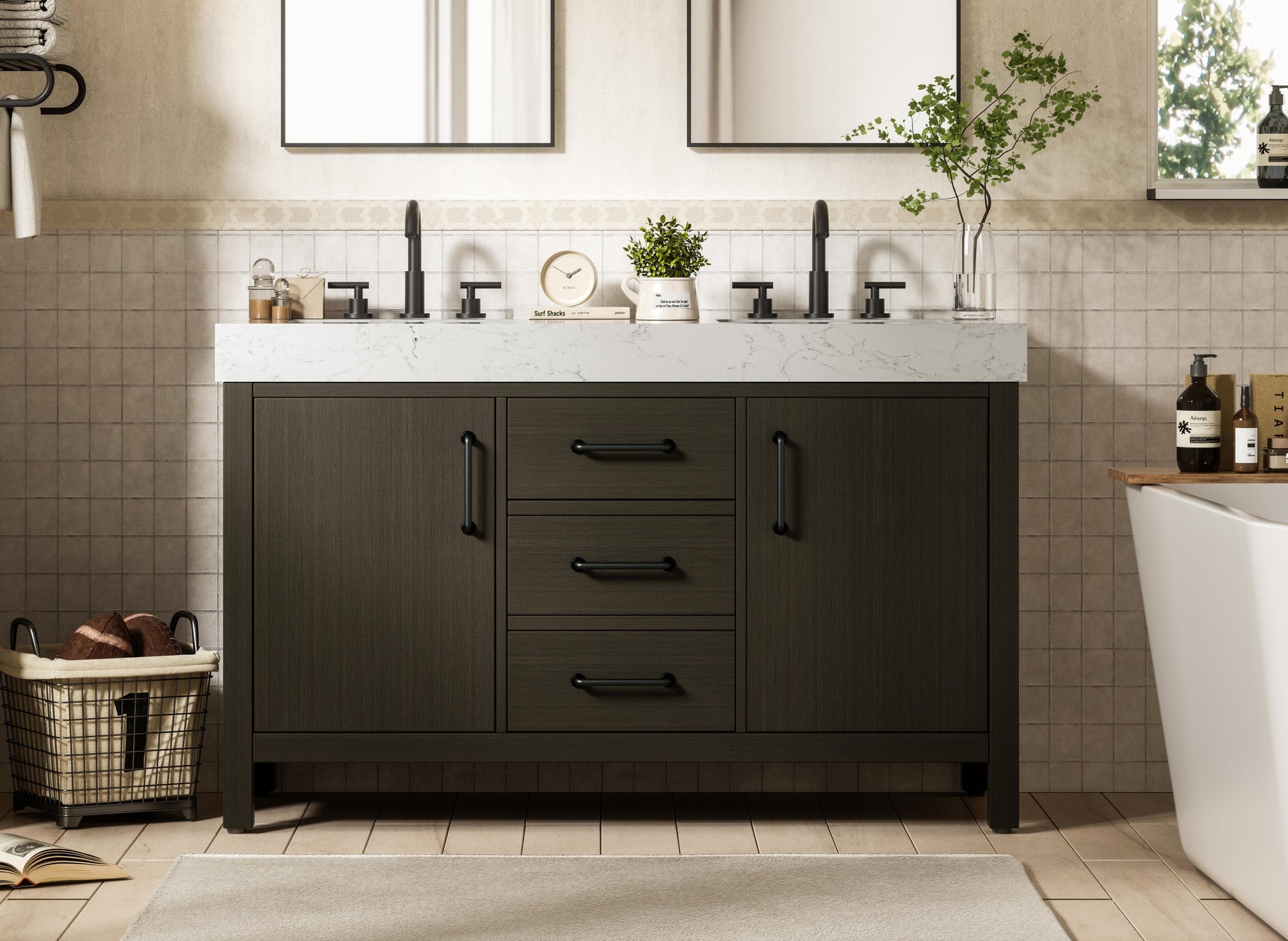 This bathroom vanity embodies a sleek, modern design with a strong, minimalist appeal. The deep mocha brown finish enhances the bold and sophisticated appearance, while the flat-panel doors and drawer fronts contribute to its clean, structured aesthetic. The wood's dark tone adds depth and richness, making it a striking focal point in any bathroom setting. The design features a double-sink layout, emphasizing functionality and spaciousness, ideal for shared bathrooms. The central drawers and symmetrical cabinet doors create a sense of balance and structure. Matte black hardware offers a bold contrast to the dark wood tone, reinforcing the modern aesthetic while maintaining a timeless appeal. The thick engineered marble countertop adds a sturdy, minimalist element, with its clean white surface further elevating the overall sophistication of the vanity. This piece is a perfect marriage of style and practicality, effortlessly complementing both modern and transitional bathroom designs. This vanity is delivered fully assembled and equipped with foot levelers for effortless installation and stability. Combining practicality and bold design, this vanity is UPC certified and ready to transform your bathroom space.