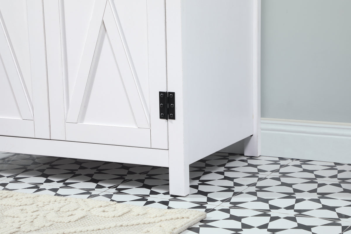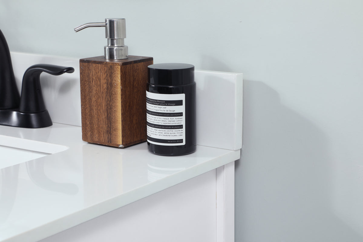 Reminiscent of barn doors, the 2 door cabinet adds both stylistic charm and function with its plethora of storage options for all your bathroom essentials. Whether for your bathroom or the guests', everyone will marvel at its classic look for traditional and farmhouse aesthetics. A slab of engineered marble rounds out the piece up top, as well as the porcelain under mount sink and predrilled faucet holes. This vanity arrives fully assembled. Comes with a matching backsplash to complete the look and protects your wall.