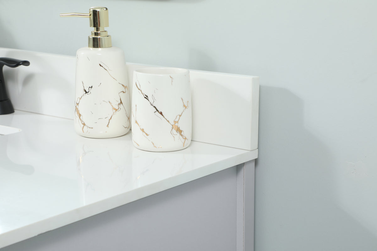 Reminiscent of barn doors, the two door cabinet and four drawers adds both stylistic charm and function with its plethora of storage options for all your bathroom essentials. Whether for your bathroom or the guests', everyone will marvel at its classic look for traditional and farmhouse aesthetics. A slab of engineered marble rounds out the piece up top, as well as the porcelain under mount sink and predrilled faucet holes. This vanity arrives fully assembled. Comes with a matching backsplash to complete the look and protects your wall.
