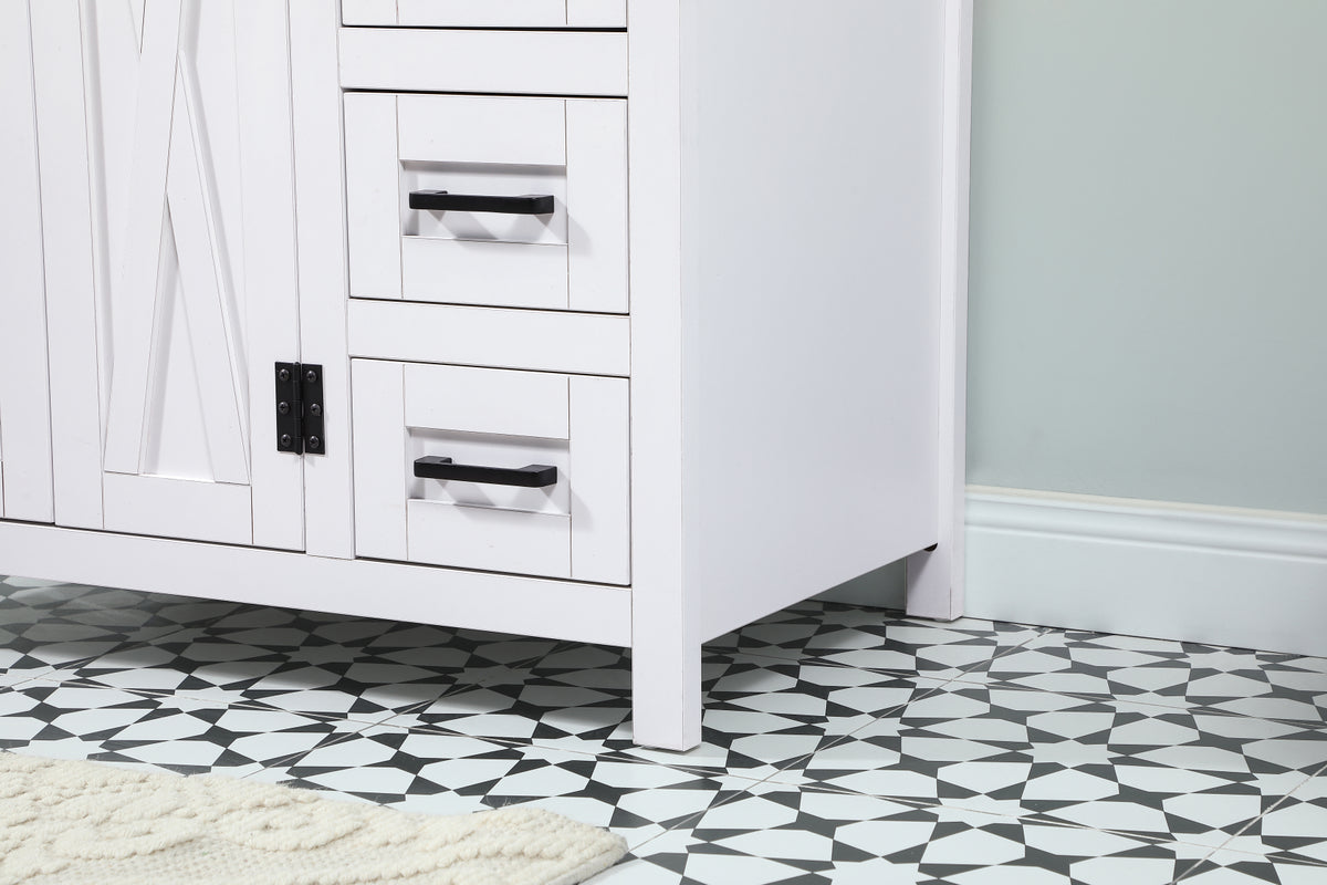 Reminiscent of barn doors, the two door cabinet and four drawers adds both stylistic charm and function with its plethora of storage options for all your bathroom essentials. Whether for your bathroom or the guests', everyone will marvel at its classic look for traditional and farmhouse aesthetics. A slab of engineered marble rounds out the piece up top, as well as the porcelain under mount sink and predrilled faucet holes. This vanity arrives fully assembled. Comes with a matching backsplash to complete the look and protects your wall.
