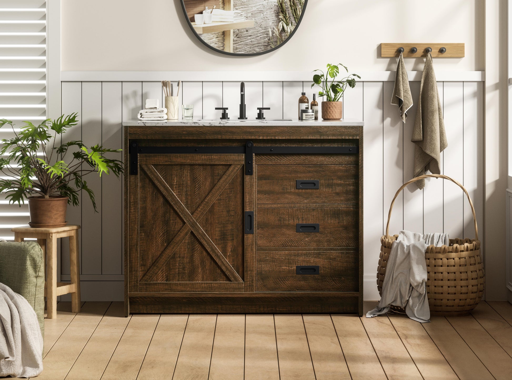 Transform your bathroom with this rustic barnyard-style vanity, designed to balance aesthetic appeal and functionality. Featuring a sliding barn door with black metal hardware and complementary handle pulls, this piece blends rugged charm with practical design. The engineered marble countertop displays unique marbling, while the porcelain undermount sink offers easy maintenance and durability. Available in Espresso, Natural Oak, and Rustic Grey finishes, this vanity suits a range of styles. It includes a deep storage drawer for larger items, a hidden shelf for towels or décor, and adjustable foot levelers for added stability on uneven floors. With pre-drilled faucet holes for easy setup, this vanity delivers style and substance to enhance your bathroom.