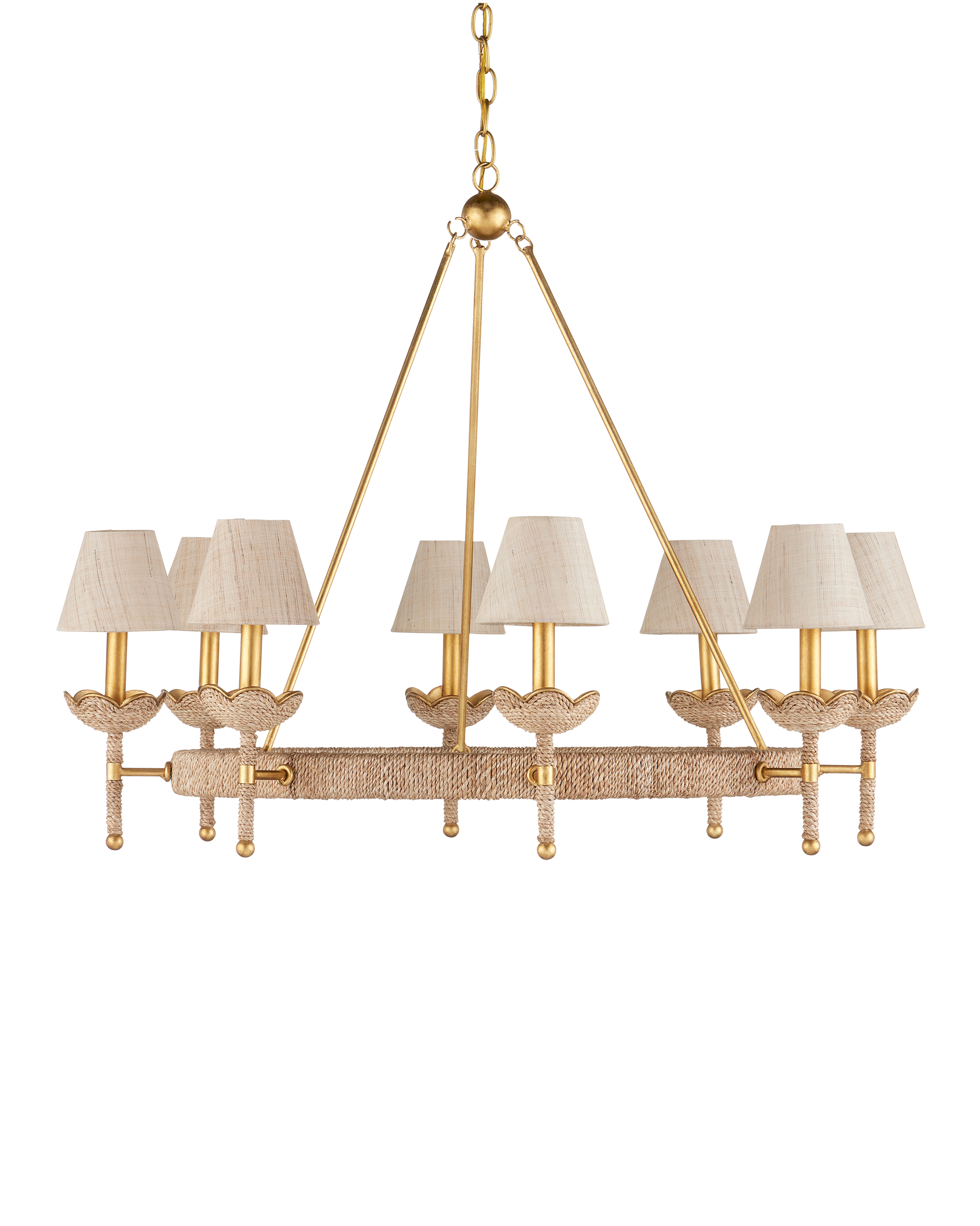 The Vichy Chandelier was created by Suzanne Duin, who founded the Houston shop and design studio Maison Maison, and is known for a keen eye in sourcing authentic French antiques and home accessories from around the globe. Each piece in her line of woven light fixtures is handmade by artisans in Southeast Asia; the Vichy an example in abaca rope and wrought iron in a mix of contemporary gold leaf and contemporary gold finishes. The finely shaped braided edges reflect Parisian style and the overall composition will brings both texture and French flair. Adjustable from 34.5" to 102.5" with use of included chain/rod kit/cable. If your space calls for a longer drop, additional chain/rods/cable is available for purchase.