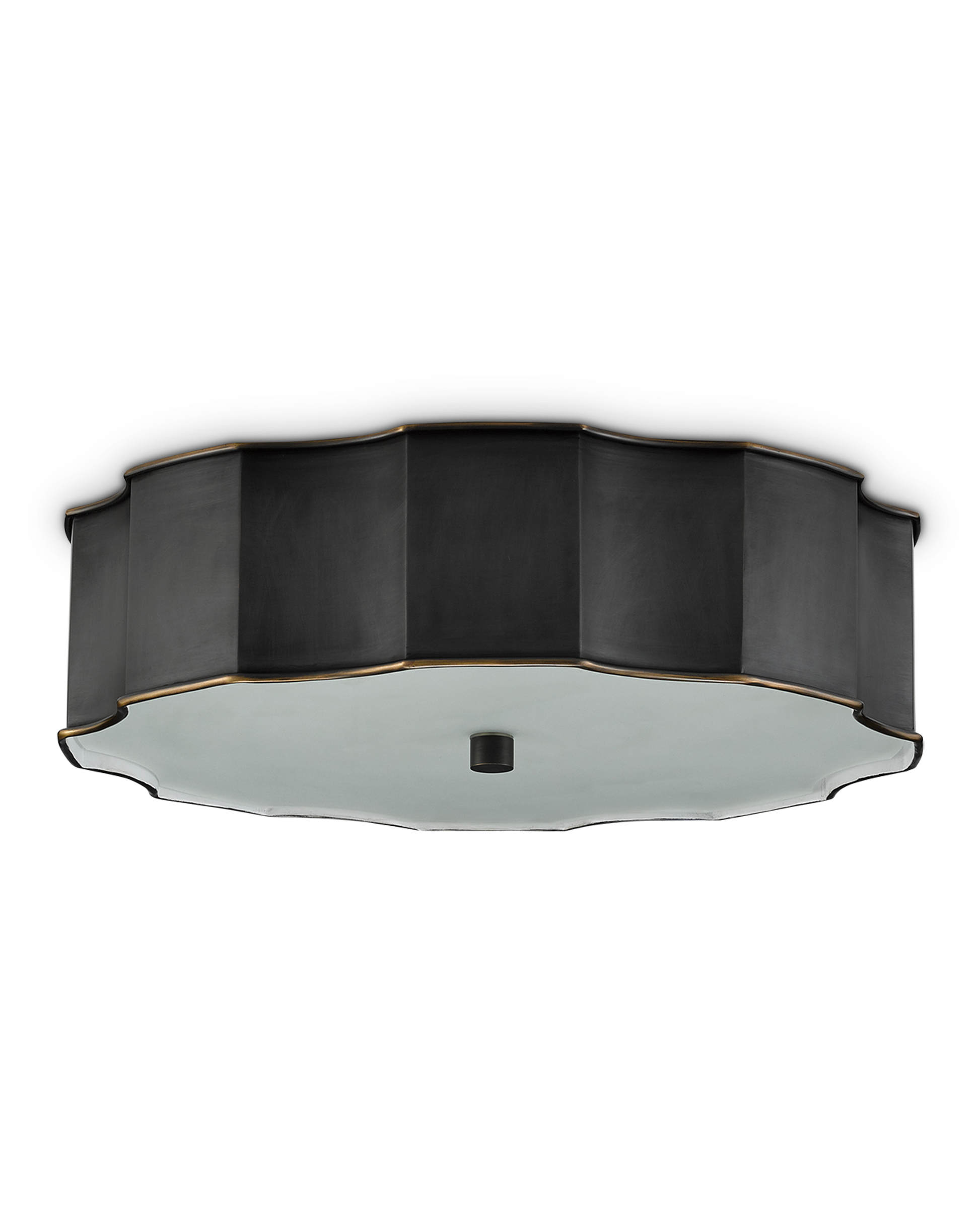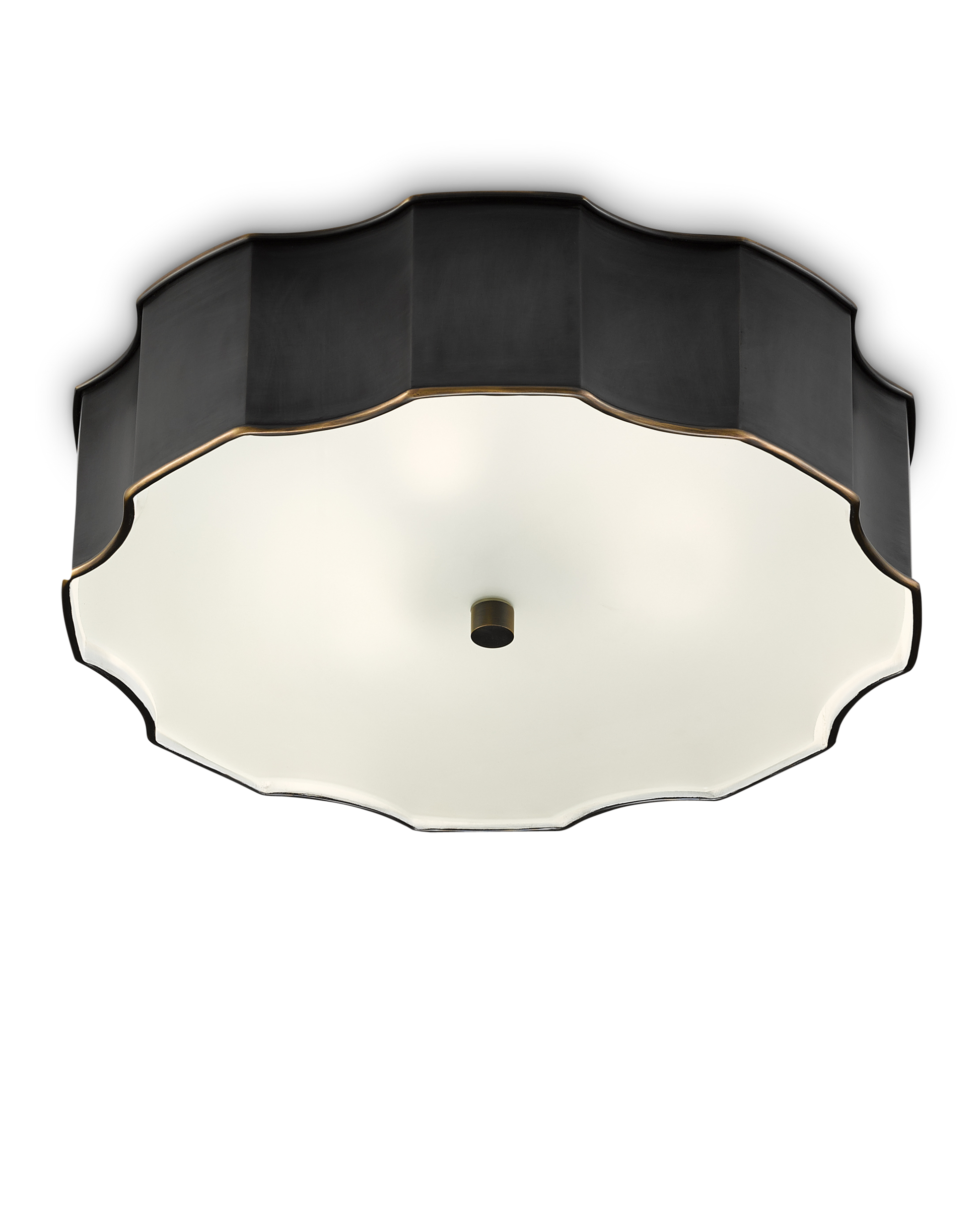 The Wexford Bronze Flush Mount is made of brass in an oil-rubbed bronze finish. The darkness of the surface contrasts the soft glow produced by the opaque glass diffuser, which is fitted to the bronze flush mount with a matching finial.