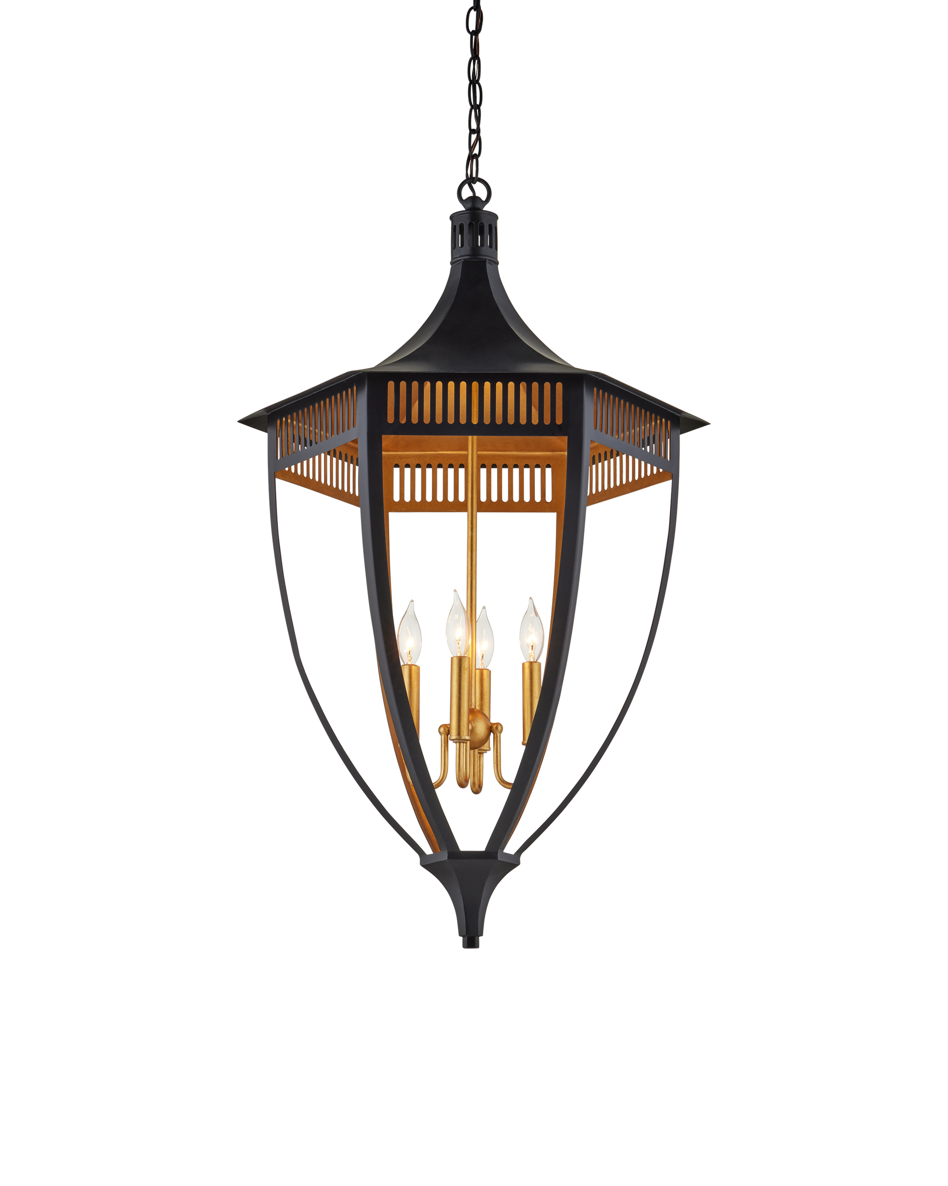 In the Bunny Williams Collection, the Wycombe Lantern has the classic lines for which this lauded designer is known. Made of wrought iron, the refined lantern is finished in a mix of satin black and contemporary gold leaf finishes. Because the interior of the black lantern is covered with gold leaf, the illumination coming from it will warmly glow. The grillework that runs along its circumference where it meets the domed top is an elegant feature. Adjustable from 44.75" to 112.75" with use of included chain/rod kit/cable. If your space calls for a longer drop, additional chain/rods/cable is available for purchase.