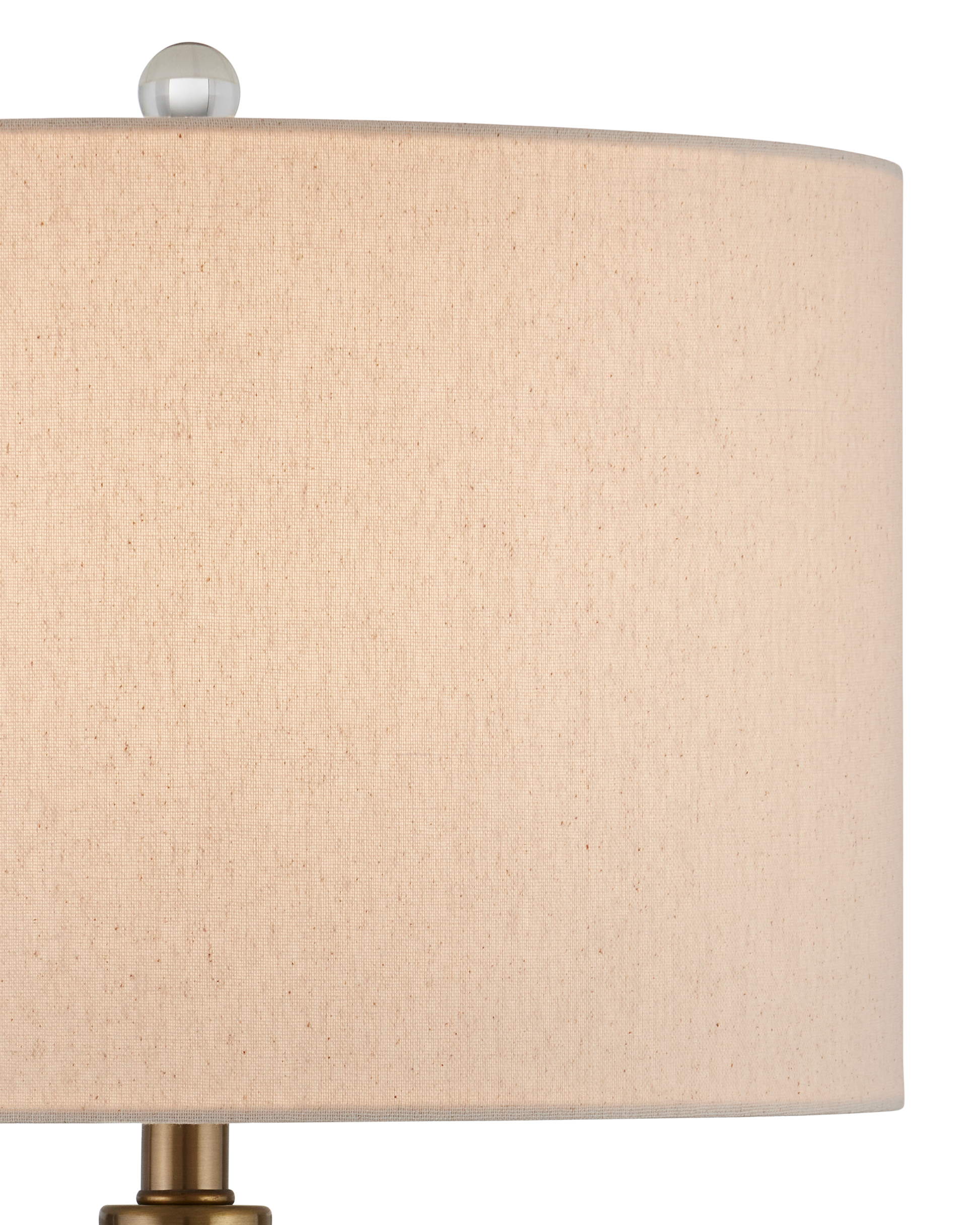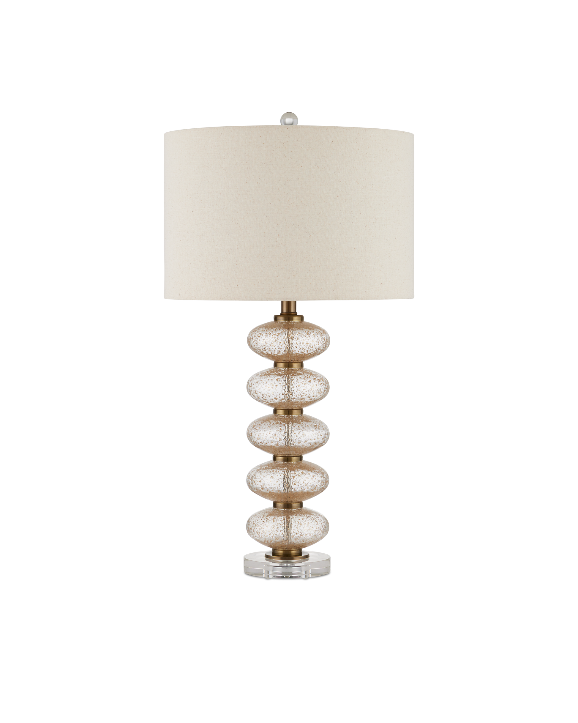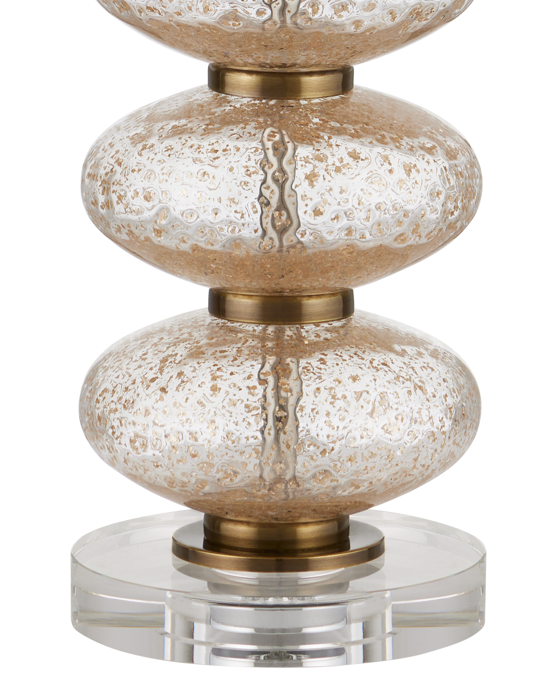 With its beautifully realized stippled glass globes that have been pressed into oblong shapes, the Zebulon Table Lamp is an artisanal wonder. The antique brass metal rings that sit between the glass elements draw out the gold speckles in the glass, and the optic crystal base and finial echo the freshness of the clear glass orbs. Because the blown glass has so much personality, this clear lamp will be a glamorous decorative element in a room.