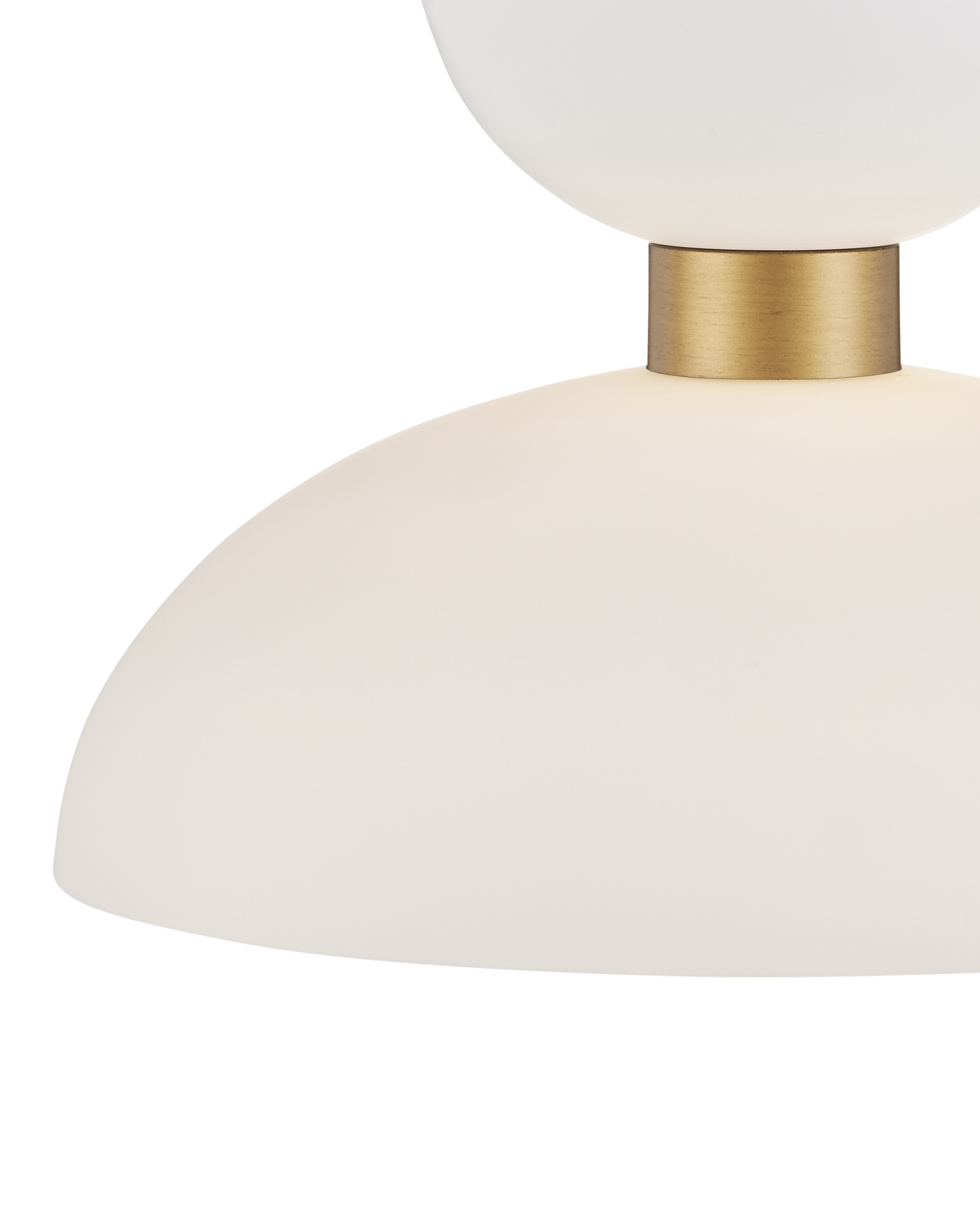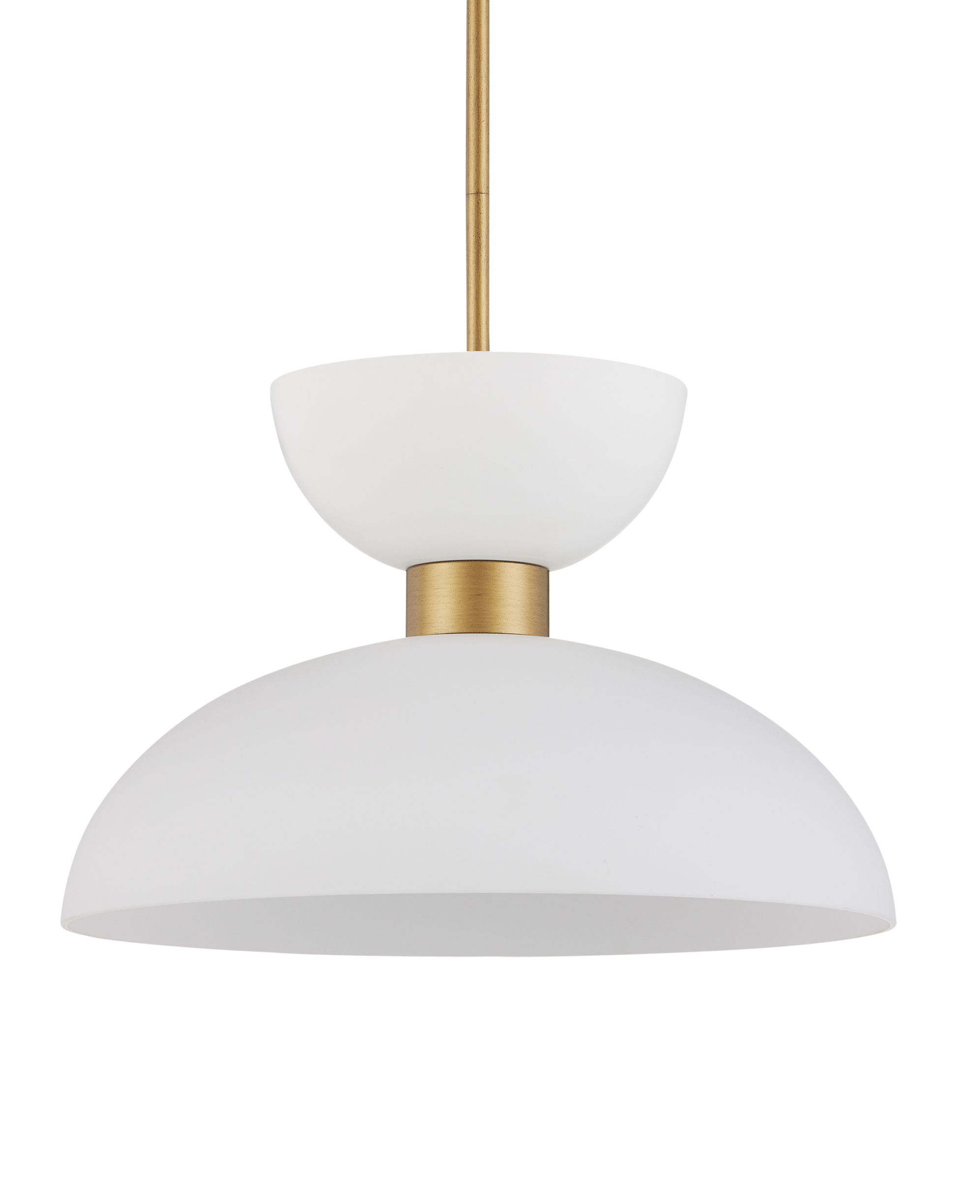 When the lights are switched off, it can be hard to tell that the top and bottom cup-shaped shades of the Zevio White Pendant are made of different materials. Ian Thornton designed the fixture with its frosted glass shade on the bottom and steel shade in a white finish on the top. The circlet that clinches these as they transition and the clean-lined stem from which the pendant hangs are contrasting elements made of brass-toned metal. Adjustable from 16.5" to 58" with use of included chain/rod kit/cable. If your space calls for a longer drop, additional chain/rods/cable is available for purchase.