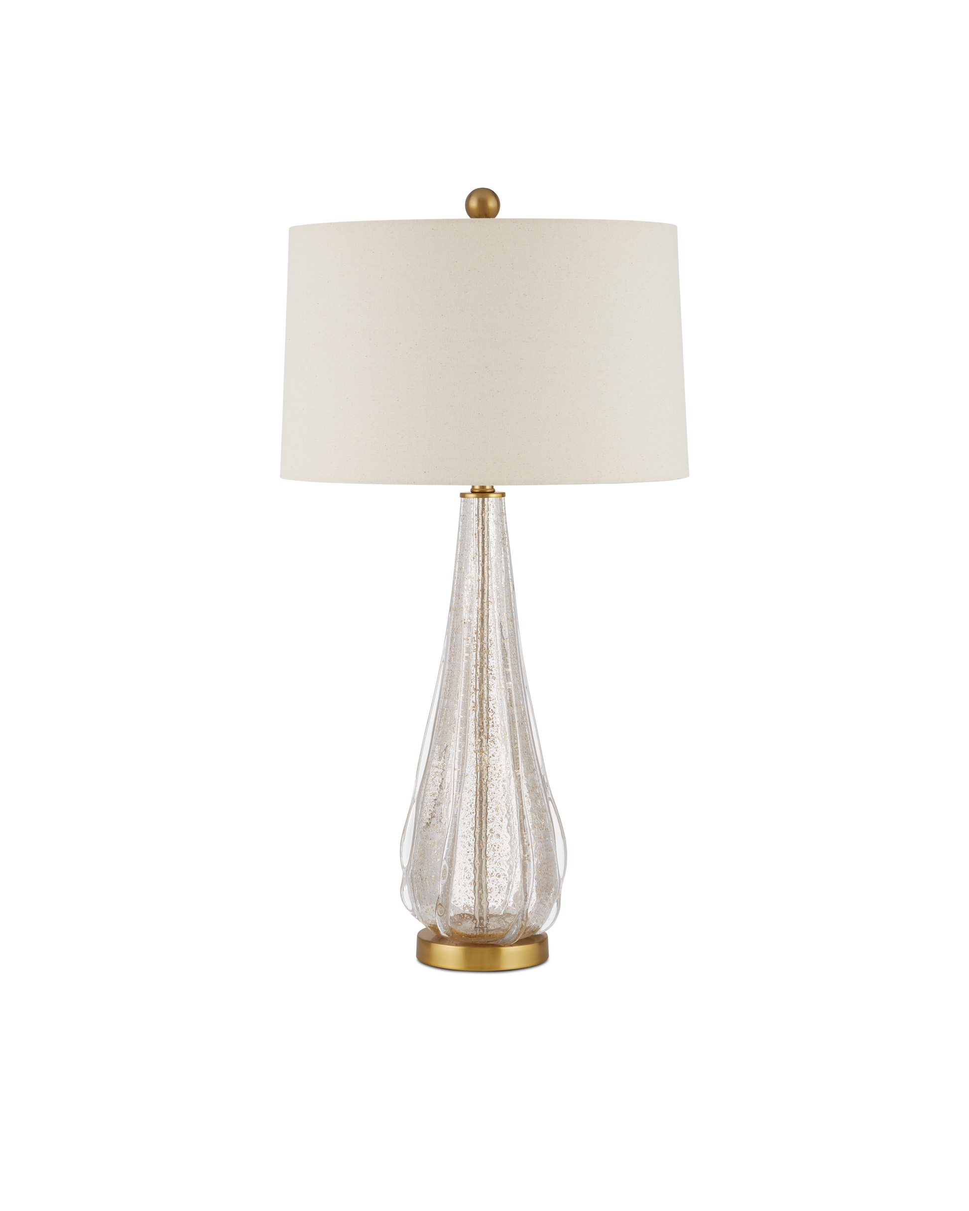 The Zyphyrine Table Lamp has a striking fluidity that stems from the flowing shape of the body that is made of blown glass. There are gold speckles sprinkled throughout the material, which adds a subtle textural feel to the clear lamp. The antique brass on the metal base and hardware draw out the flecks in the glass, as does the finial in the same finish. Because blown glass is so unique from creation to creation, there will be subtle differences in each of these fixtures.